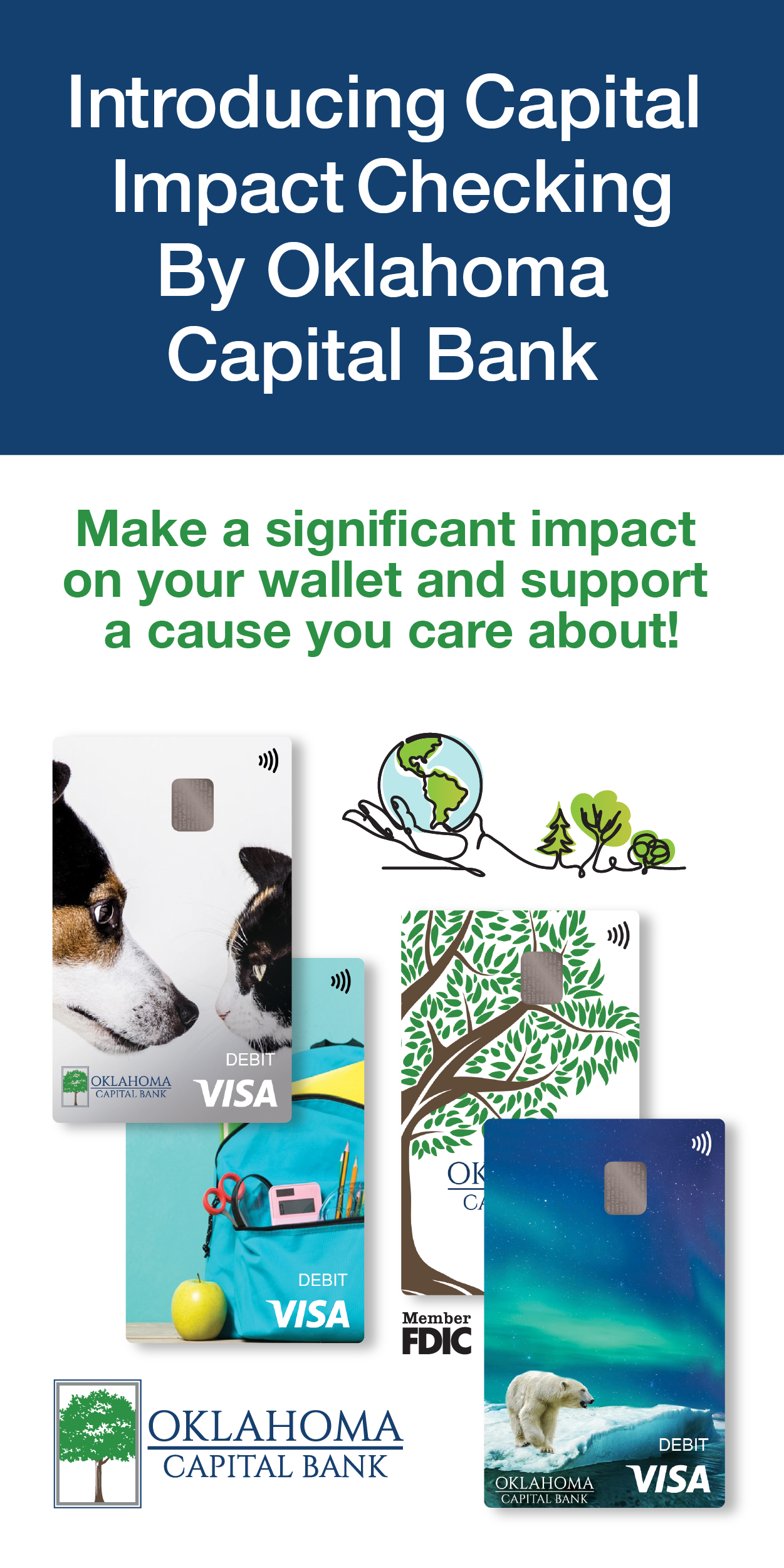 *Some legalese for all Impact Checking Accounts: Each recipient charity will be selected by Oklahoma Capital Bank and will support the cause indicated by the card design. Cardholders selecting the backpack design can pick a local school district, but not a specific school in that district. All charitable causes will be paid an amount equal to or greater than the amount deposited to the cardholder account except for the Folds of Honor (FOH) design, which pays all proceeds to the charity, and the OCB Tree logo card, which does not pay a charity. FOH will be paid 3 cents for every cardholder transaction over $5. All other charitable causes receive 1/2% of cardholder transactions over $5. Oklahoma Capital Bank reserves the right to change the percentage paid to cardholders and to charitable causes at any time. If choosing a card that pays you, your account will receive an ACH credited monthly for the prior month's transactions. If your account is closed prior to receiving the ACH credit, you will have forfeited that credit. Payments made to charities and schools are not deductible by the cardholder.